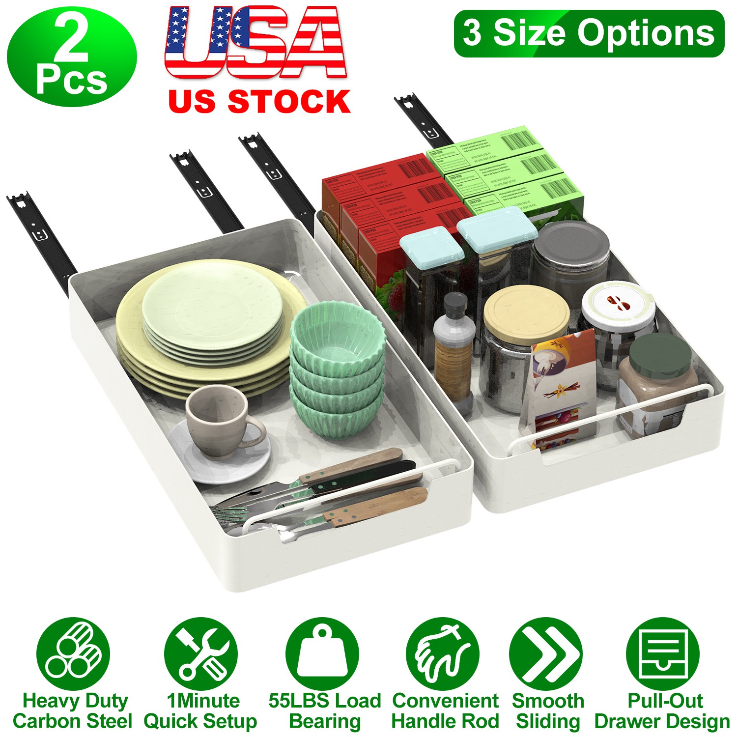 Home > 2Pcs Pull Out Cabinet Organizers Sliding Shelf Spice Rack Carbon Steel Roll Out Drawers Fixed with Adhesive Nano Film with Handle 55LBS Max Load