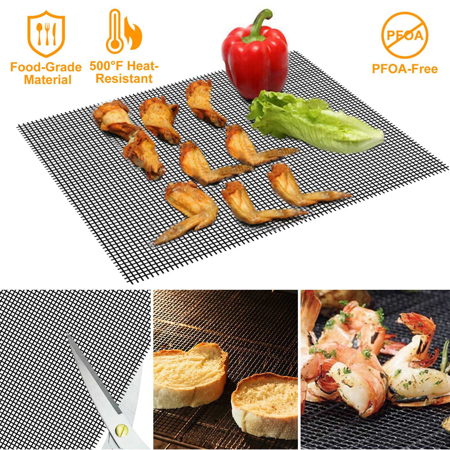 Are you frustrated when your food falling into the grill? Our grill mat can offer you an optimal solution to prevent accidents happening. Features 100% non-stick performance to allow you to grill without grease and make it clean easily. Adopts premium materials coated with fiberglass fabric which can withstand high temperature up to 500℉. The gill mat is suitable for grilling meat, vegetable, pizza and more, easily fitting into any gill, stove, pan, cake tin or oven liner.