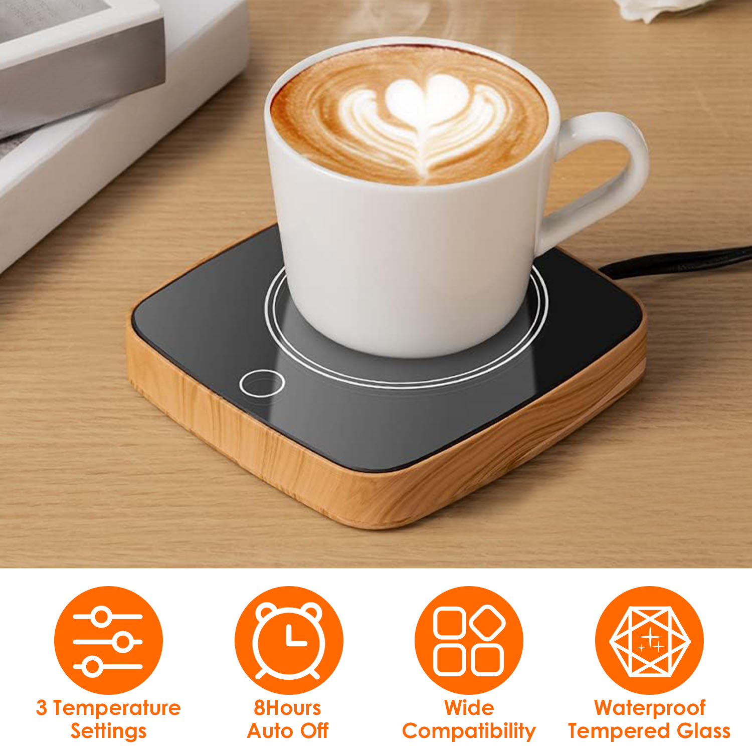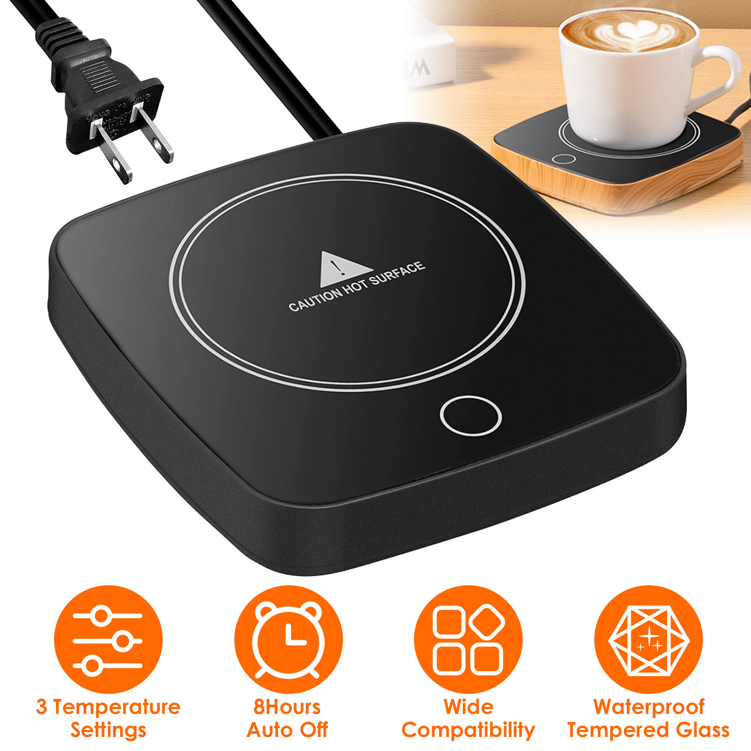 Our cup warmer is an ideal helper to solve the problem of frequently reheating your drinking in the microwave. Come with 3 adjustable temperature levels, keep your coffee, tea or hot chocolate at the desired temperature without worrying about cooling down. Considerate 8hours auto shut off ensures usage safety, perfectly suitable for most types of cups in daily life. A great gift for your friends and family in this chilling winter.