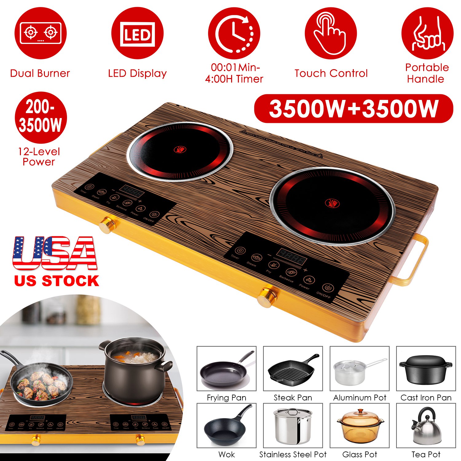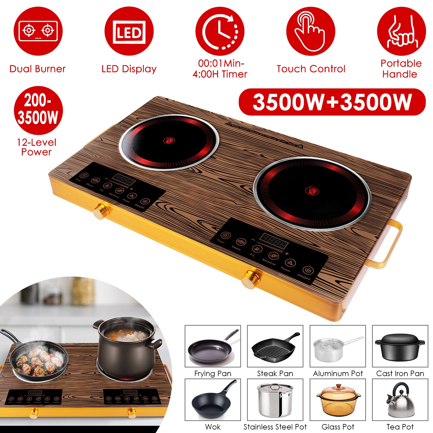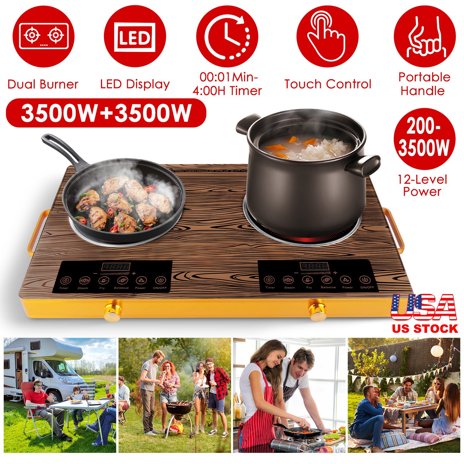 This powerful 110V dual-burner cooktop delivers rapid 3500W+3500W heating for fast boiling and searing, featuring four preset cooking modes (Steam, Fry. Barbecue, Power) for convenience and 11 precise power levels for versatile control. Includes a handy 0-4 hour timer and overheat protection for safety cooking. Its portable design with handles and sturdy heat-resistant glass surface makes it ideal for dorms, RVs, and camping, while wide compatibility works with most flat-bottomed cookware.