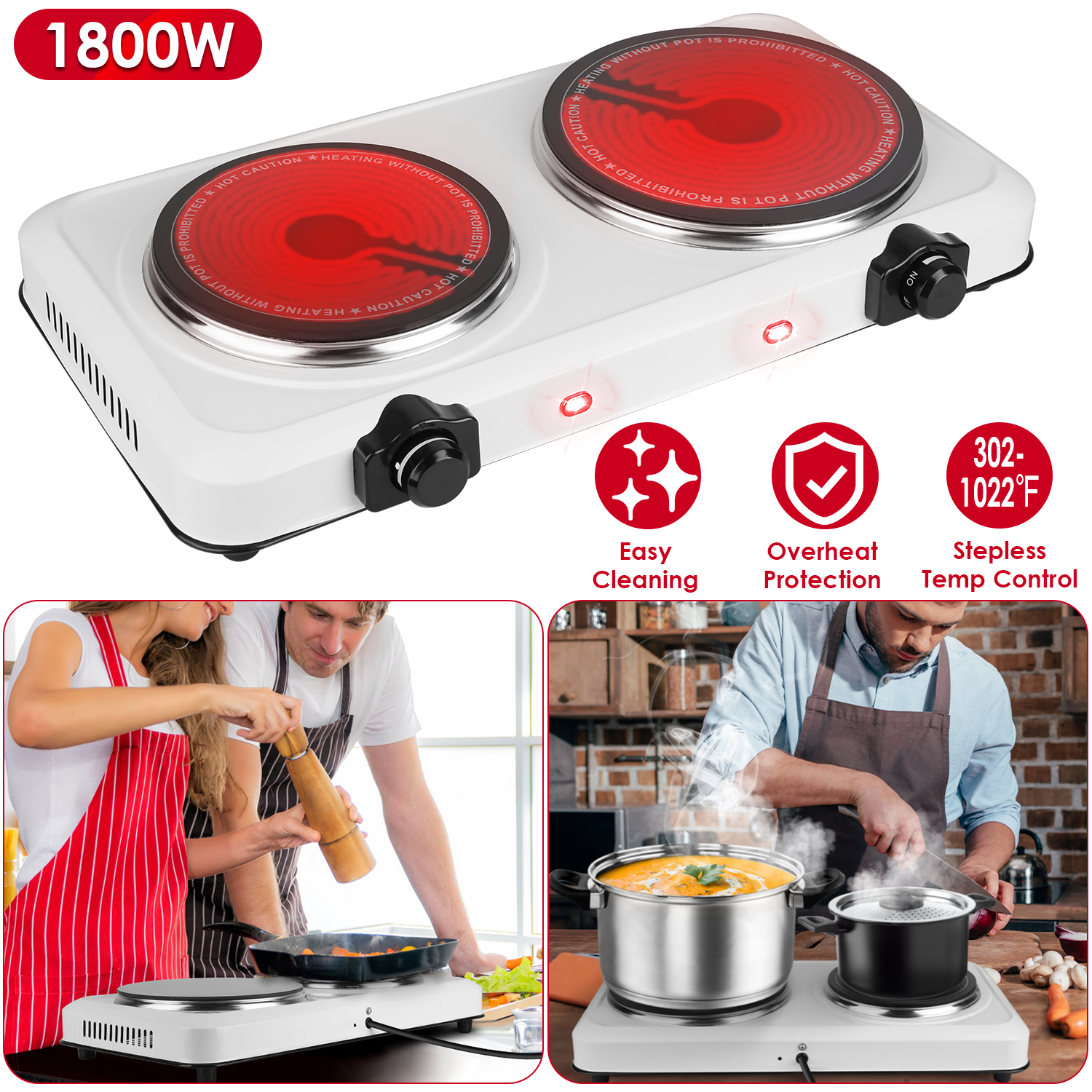 This compact infrared dual burner is great for events and traveling! The lightweight and compact design allows for easy storage and carrying. The hot plate burner with special infrared technology distributes heat quickly and evenly for great performance at 302-1022℉ stepless adjustable temperature. 7.5in-Diameter & 6.3in-diameter glass heating plates make it suitable for most cookware with diameter≤7.5in/6.3in, such as frying pans, woks or stovetop teapots made from aluminum, stainless steel, iron, glass, etc.. Perfect for camping, student accommodation, holiday homes, caravans, campers, offices or as an extra cooking surface in a busy kitchen. A sleek clean black finish adds style and a sleek appearance to this wonderful kitchen addition!