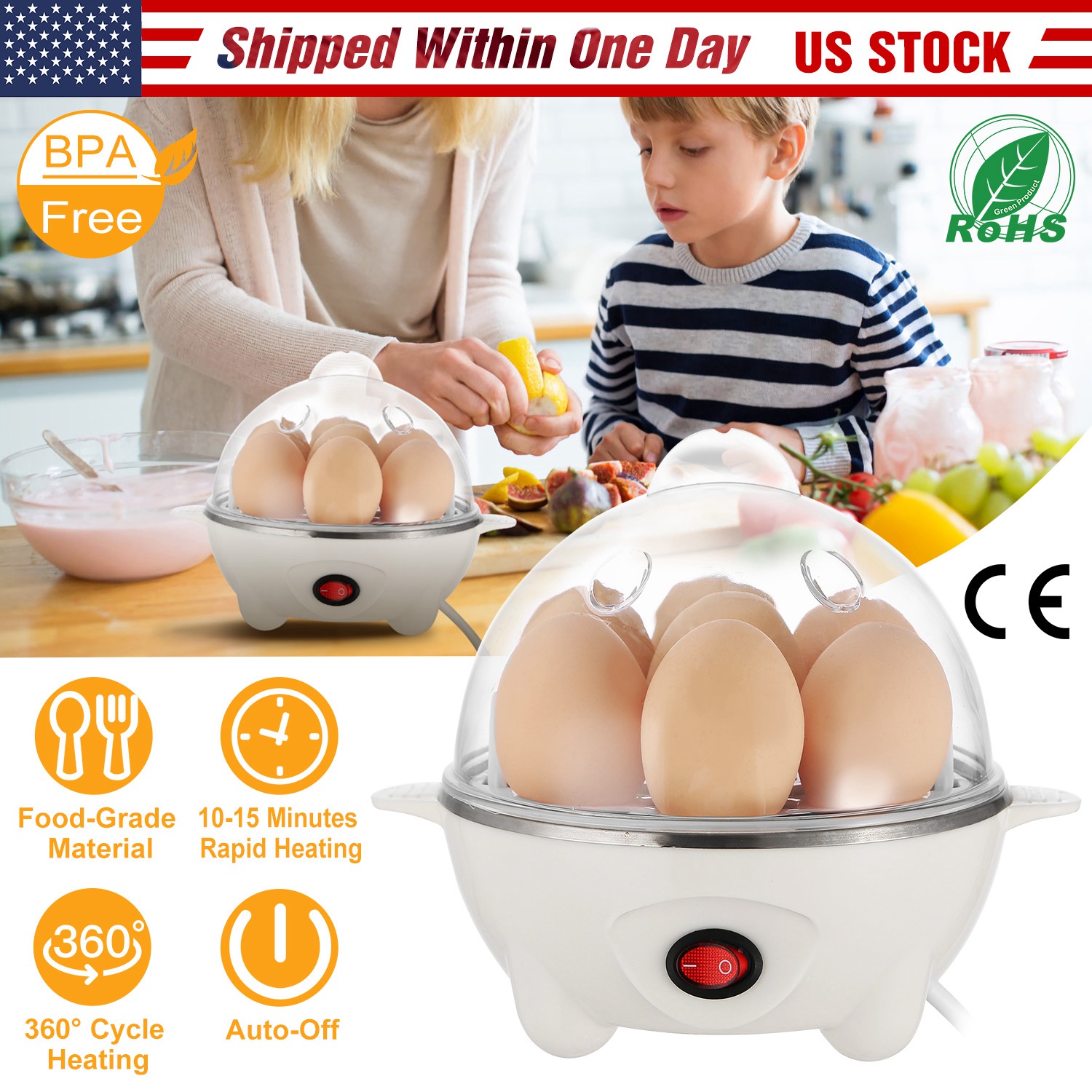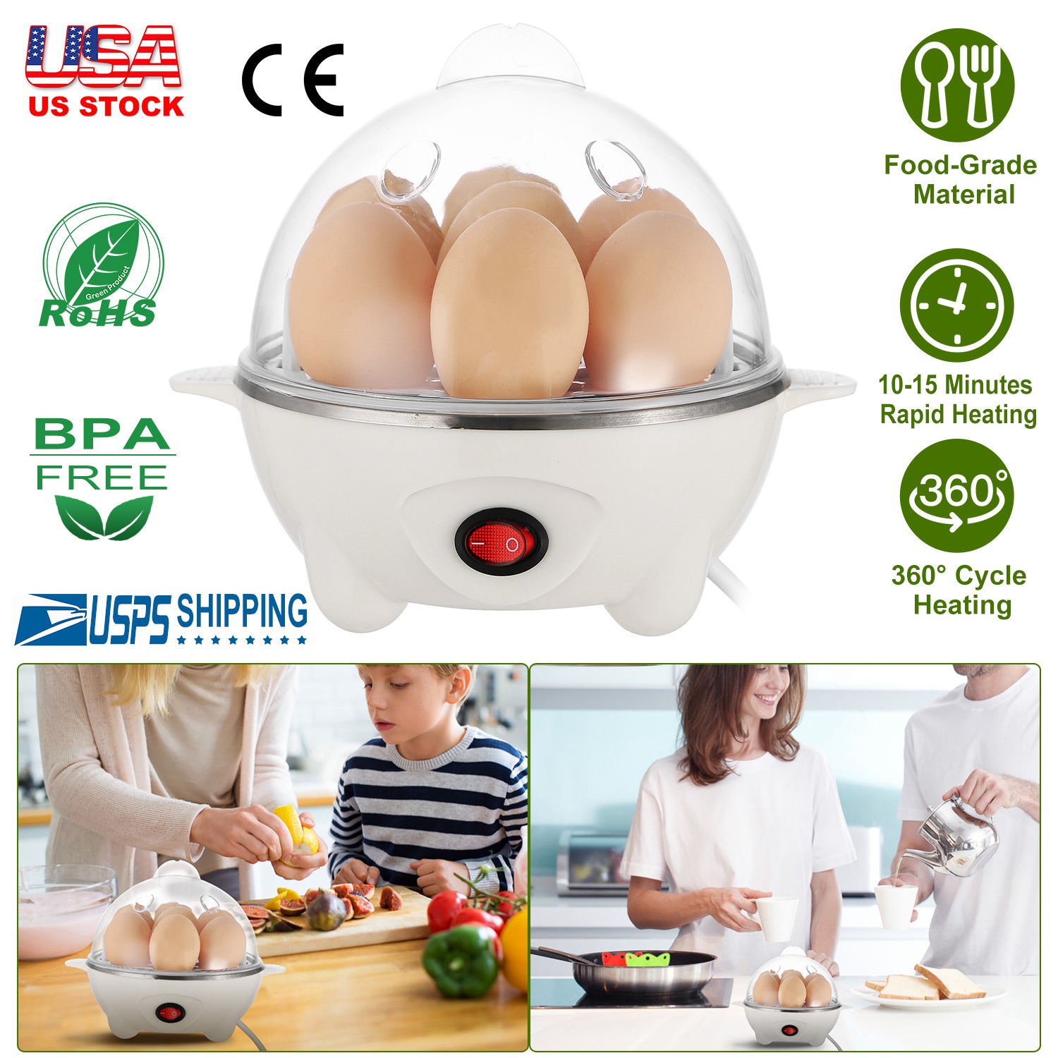 Our electric egg cooker can boil 7 eggs once in 10-15 minutes, helps you make a quick and healthy breakfast that your family will love. Come with a measuring cup with water volume instruction for you convenience to cook and get different tastes of boiled eggs (soft or hard) in 3-4 operating steps. Made of food-grade BPA-free PP plastic and stainless steel and with auto-off design, our egg cooker is safe to use. With our egg cooker, you are not only able to get cook hard boiled eggs, soft boiled eggs, but also able to steam vegetables seafood dumplings, etc. It’s an excellent kitchen helper for picky eaters, large families housewife, or those who have busy schedules.