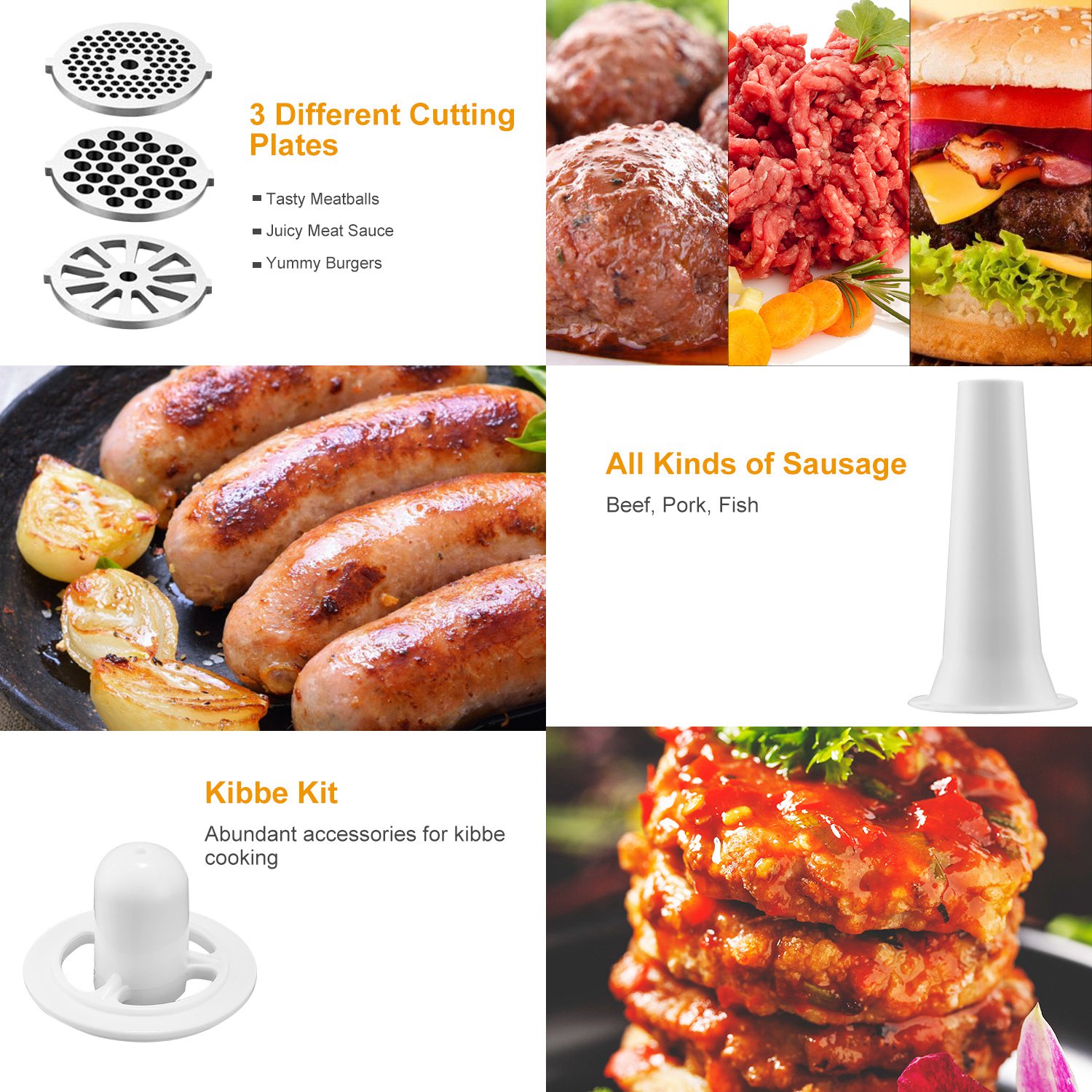 Our electric meat grinder is coming to be your excellent kitchen helper. Its engine with power up to 2800W to support productivity of 0.77lbs minced meat per minute depending on the size of grinding plate you are using and the type of meat you are grinding, which is ideal for ground meat and stuffing making, fast and conveniently. 3 Cutting plates which are different in the diameters of the mesh, can be used for fine, medium and coarse grinding to meet your need of making stuffing in different size. Also, trough the extrusion of three spiral circles of the spiral rod attachment, the meat will be squeezed out without destroying the meat fiber to make meat being chewy. Moreover, with the sausage funnels and Kibbe attachment, you can start making the most mouth-watering burgers, meatballs, meat loaf, sausages and more by creating your own personalized meat blends at ease.