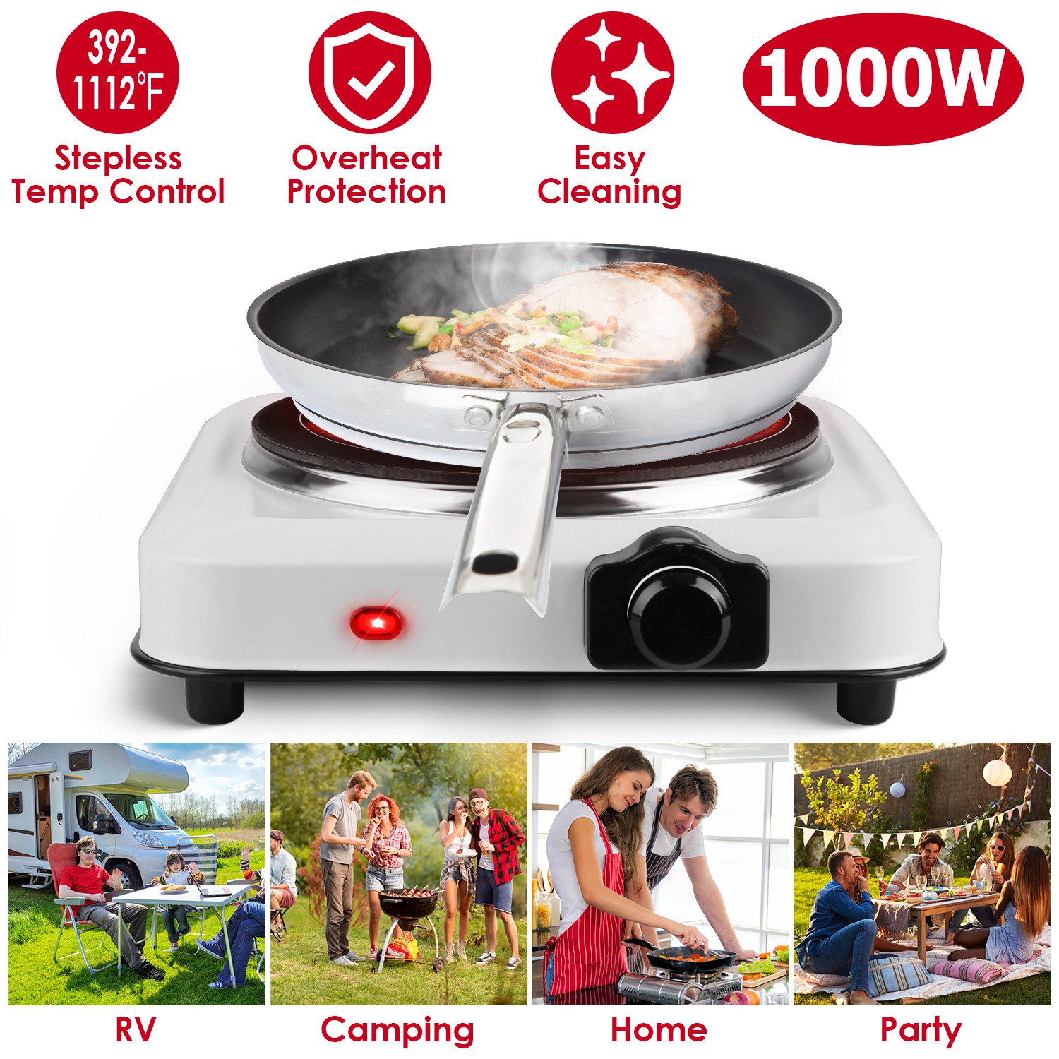 This compact infrared single burner is great for events and traveling! The lightweight and compact design allows for easy storage and carrying. The hot plate burner with special infrared technology distributes heat quickly and evenly for great performance at 392-1112℉stepless adjustable temperature. 7.5in-Diameter glass heating plate makes it suitable for most cookware with diameter≤7.5in, such as frying pans, woks or stovetop teapots made from aluminum, stainless steel, iron, glass, etc.. Perfect for camping, student accommodation, holiday homes, caravans, campers, offices or as an extra cooking surface in a busy kitchen. A sleek clean black finish adds style and a sleek appearance to this wonderful kitchen addition!