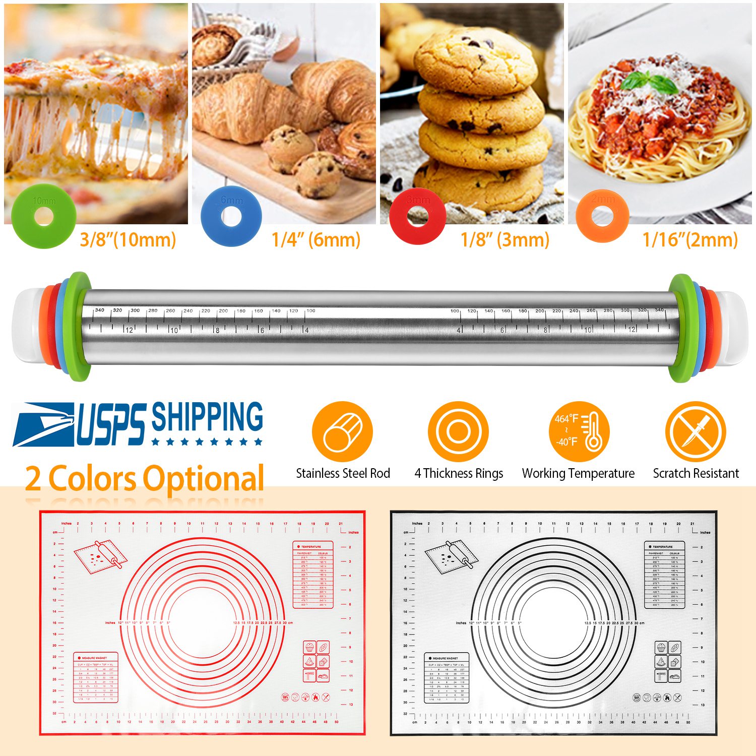 Dough Rolling Pin Dough Roller Stainless Steel Rolling Pins with 4 Removable Adjustable Thickness Rings and Rolling Mat for Baking Pizza Fondant Pie C