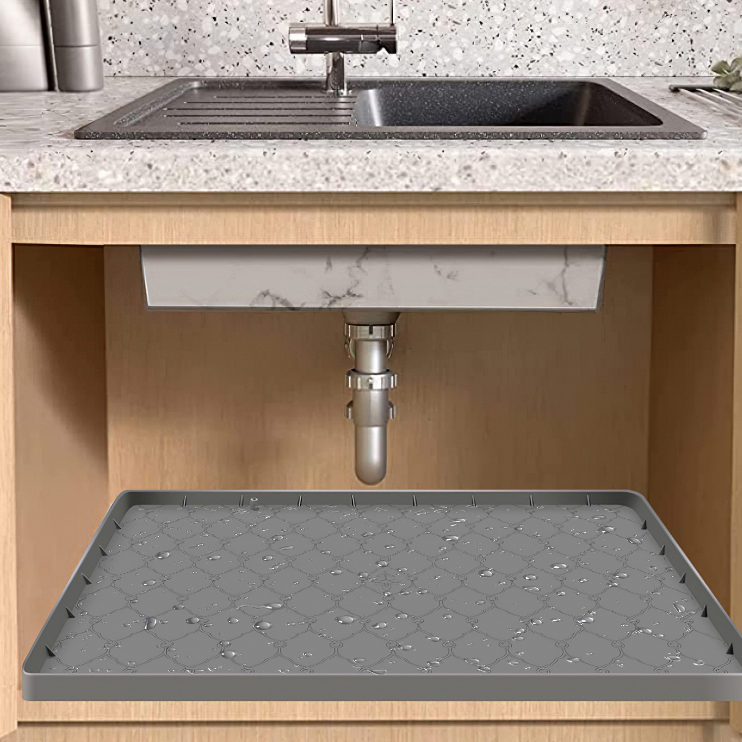 Made of environmentally friendly silicone, our under sink mat provides a secure and slip-free area for you to place your cleaning supplies or kitchen tools without slipping or sliding. Also, water or spills will be effectively contained, reducing the risk of damage to your cabinets. Holds up to 3 gallons of liquid and fits for standard 36-inch kitchen and bathroom cabinets. Also comes with a drain hole to allow for quick and efficient drainage. Easy to clean.Also suitable for pet feeding mats, access door mats, tool mats, craft mats or any other occasions to avoid mess and spills.