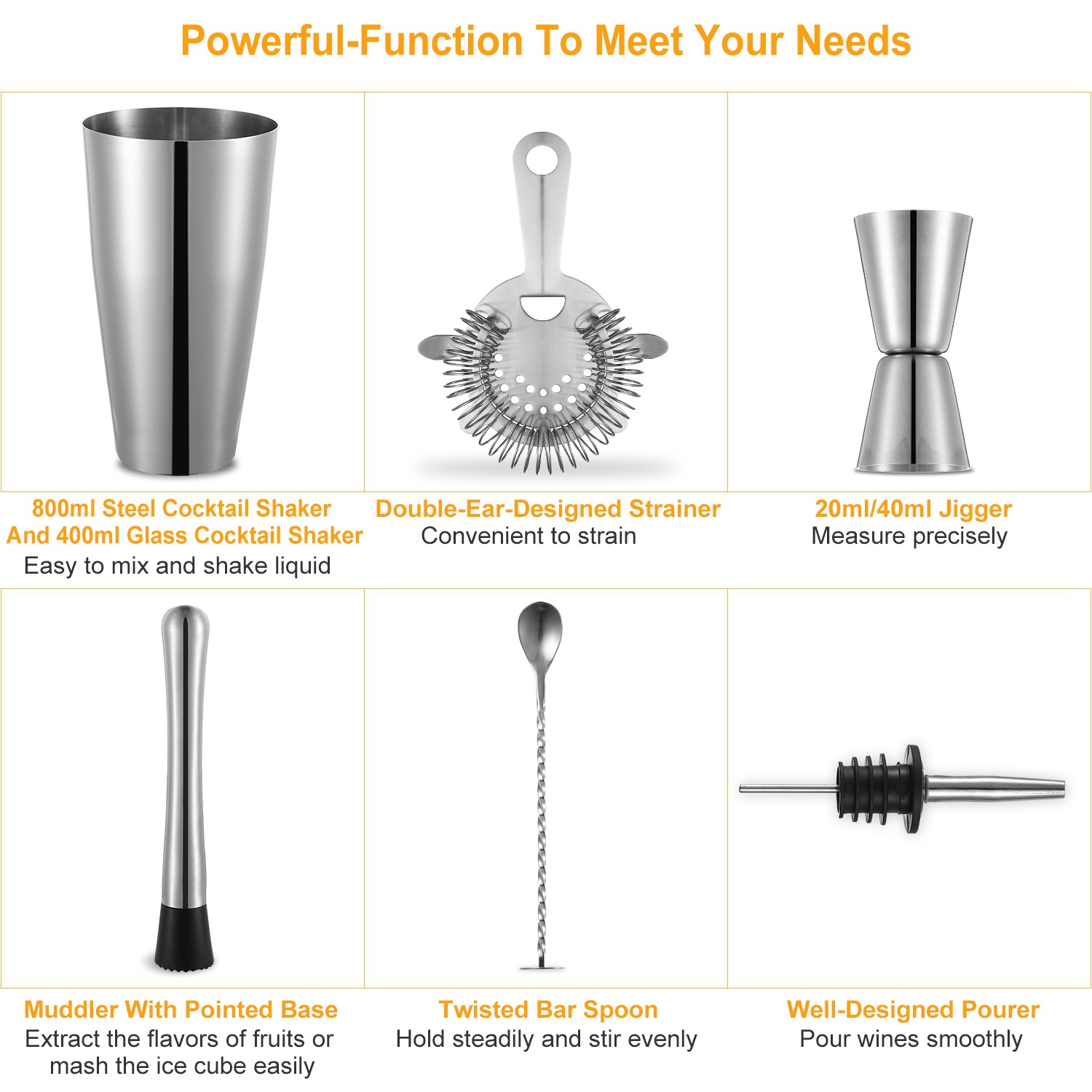 Share an elegant and colorful life with your family members, friends, colleagues or any one you want. Our complete 8pcs cocktail set (1pcs steel cocktail shaker, 1pcs glass cocktail shaker, 1pcs muddler, 1pcs pourer, 1pcs bar spoon, 1pcs strainer, 1pcs jigger and 1pcs silicone ring for glass cocktail shack) is produced to meet your needs by providing an effortless way to mix and shack with our 800ml steel cocktail shaker and 400ml glass cocktail shaker, strain conveniently with our double-ear-designed strainer, extract the flavors of fruits or mash the ice cube with our muddler, stir evenly with our bar spoon, measure precisely with our 20ml/40ml jigger and pour wines smoothly with our pourer.