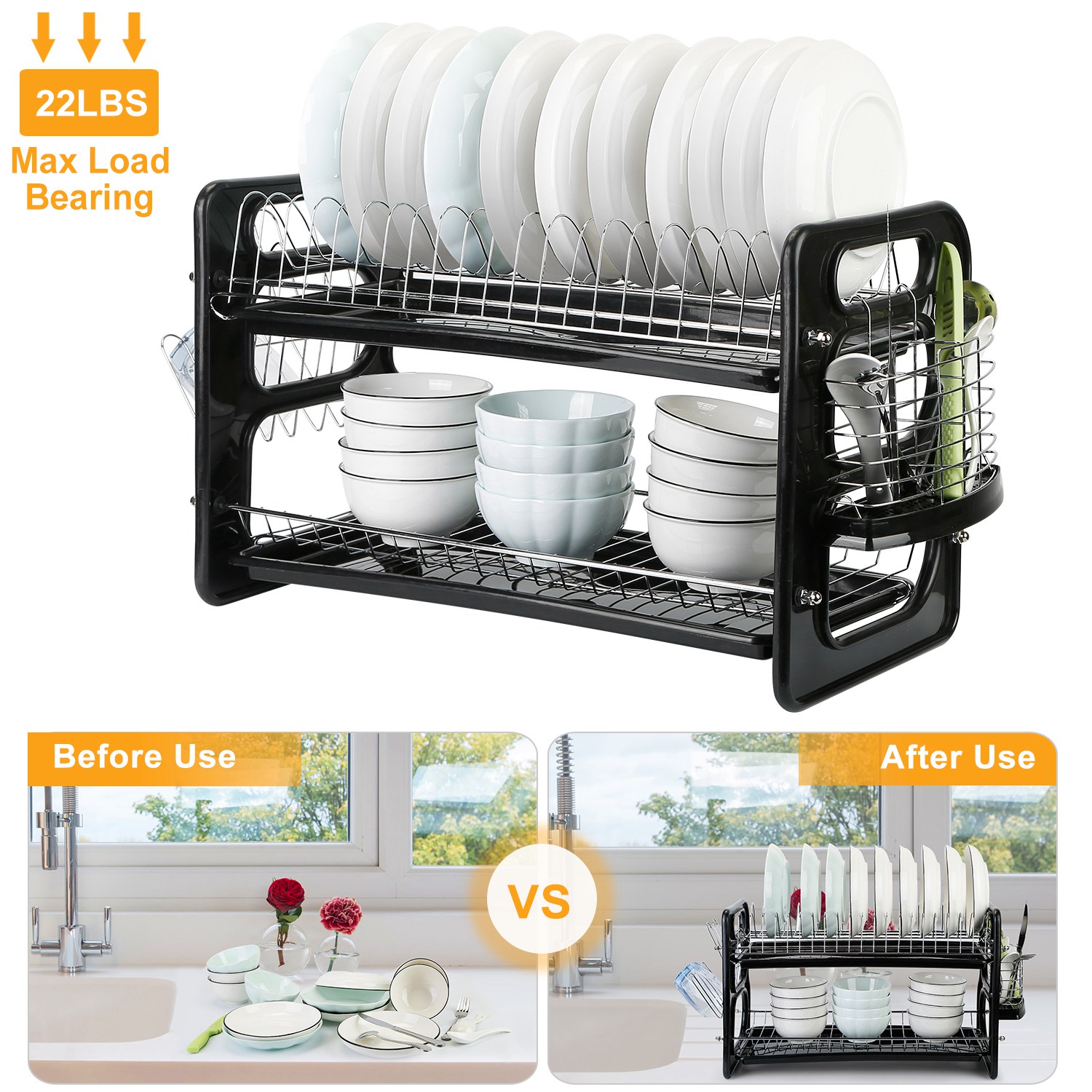Are you still upset about the messiness of your kitchen? Are you trouble with the water leaking from wished dishes? This dish drying organizer rack is a must-have in your kitchen! Not only can be used as a dish drainer for air-drying kitchenware, but also an organizer holder for washed bowls, glasses, cups, plates, knife and fork, cookware and son on. This dish rack features large storage capacity and up to 22lbs load bearing. Don't worry about a wobbly top shelf, our dish rack is built tough and will not break.