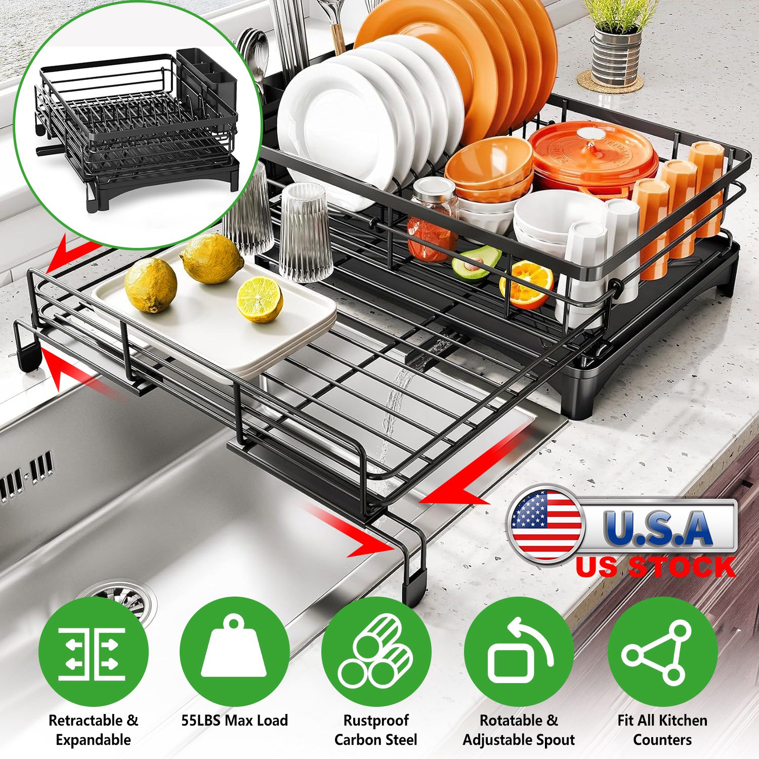 Retractable Dish Drying Rack Extra Large Dish Rack with Drainboard Utensil Holder for Countertop Over Sink Rustproof Expandable