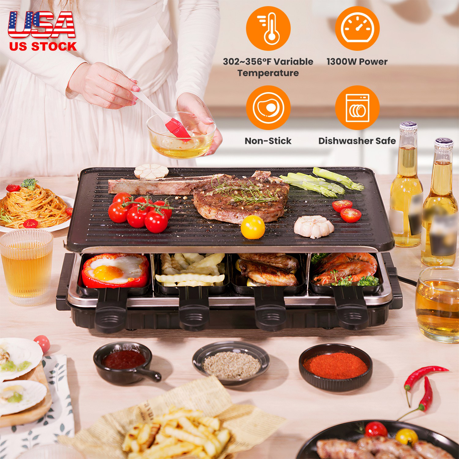 Home > 1300W Raclette Desktop Grill for 8People Non-Stick Reversible Electric Indoor Griddle with 8 Cheese Melt Pans Adjustable Temperature Dishwasher Safe K