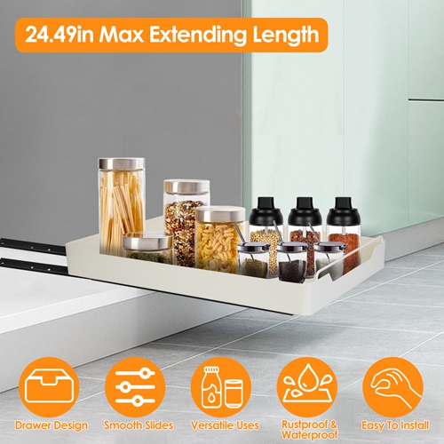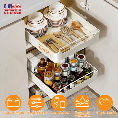 Get tired of bending or kneeling to reach items on lower shelves? Designed with a drawer feature, our pull out cabinet organizer allows you to easily take out any item via pulling out the N-shaped handle. Make the most of small space and allow you to easily access all your pots, pans, small kitchen appliances, cleaning products, canned goods, and other items. The 2 damping guide rails is able to slide smoothly without unpleasant noise and withstand 1,000 pulls. Widely used in kitchens, pantries, bathrooms, living rooms, offices etc.. Constructed out of robust carbon steel, rustproof and waterproof. Adhesive design makes itself easy to install within 4S. A perfect pull-out home organizer!