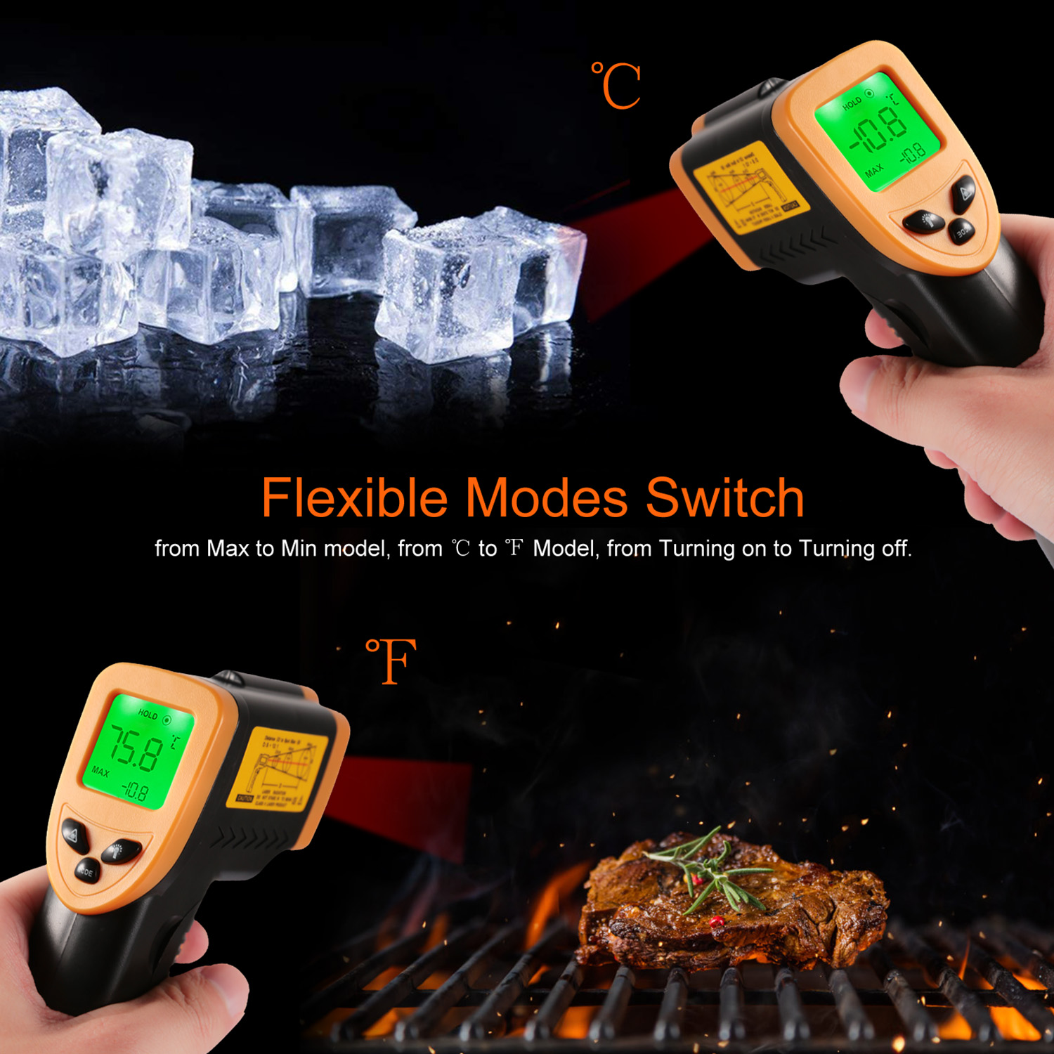 Our iMounTEK Digital Laser Thermometer adopts ABS material and digital LCD screen, durable and clear display. Inbuilt IR sensor enables us to measure the target temperature quickly and accurately. Free switch from Max to Min model between ℃ and ℉ Model, or from Turning on to Turning off. Widely used for food temperature gauge or in industrial thermometer.