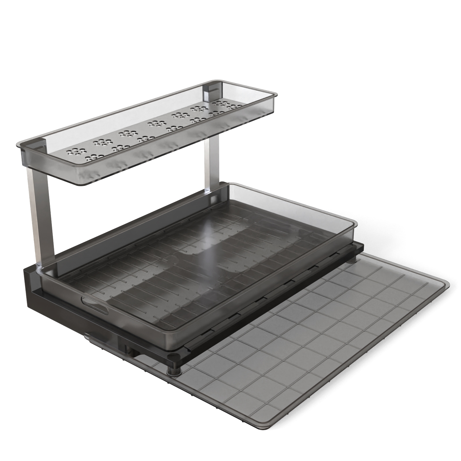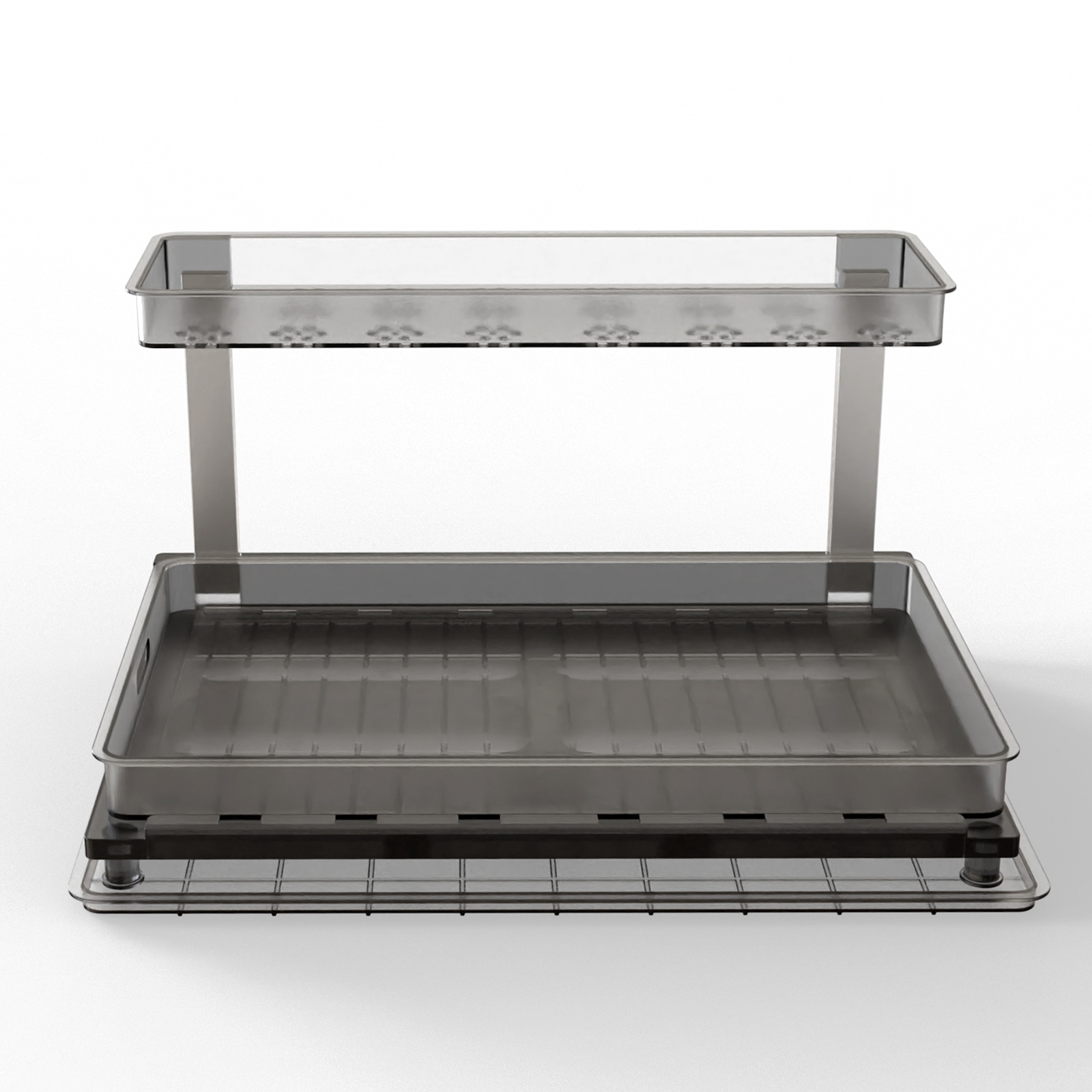 Our 2-tier under-sink organizer maximizes storage space with its unique L-shaped design, efficiently use vertical space while fitting snugly around plumbing fixtures. Perfect for storing cleaning supplies in various locations like bathrooms, kitchens, food pantries, and offices. The upper fixed basket keeps smaller items easily accessible while the bottom sliding-out basket allows effortless access to heavier essentials from both sides. Constructed of thickened PET material, stainless steel pipes, it's sturdy, rustproof, and has great loading capacity. Additionally, the top basket features hollow design providing excellent drainage. The assembly process is rapid and tool-free, use stainless steel pipes to connect the upper basket with base and insert the drawer tray, instant setup within minutes.